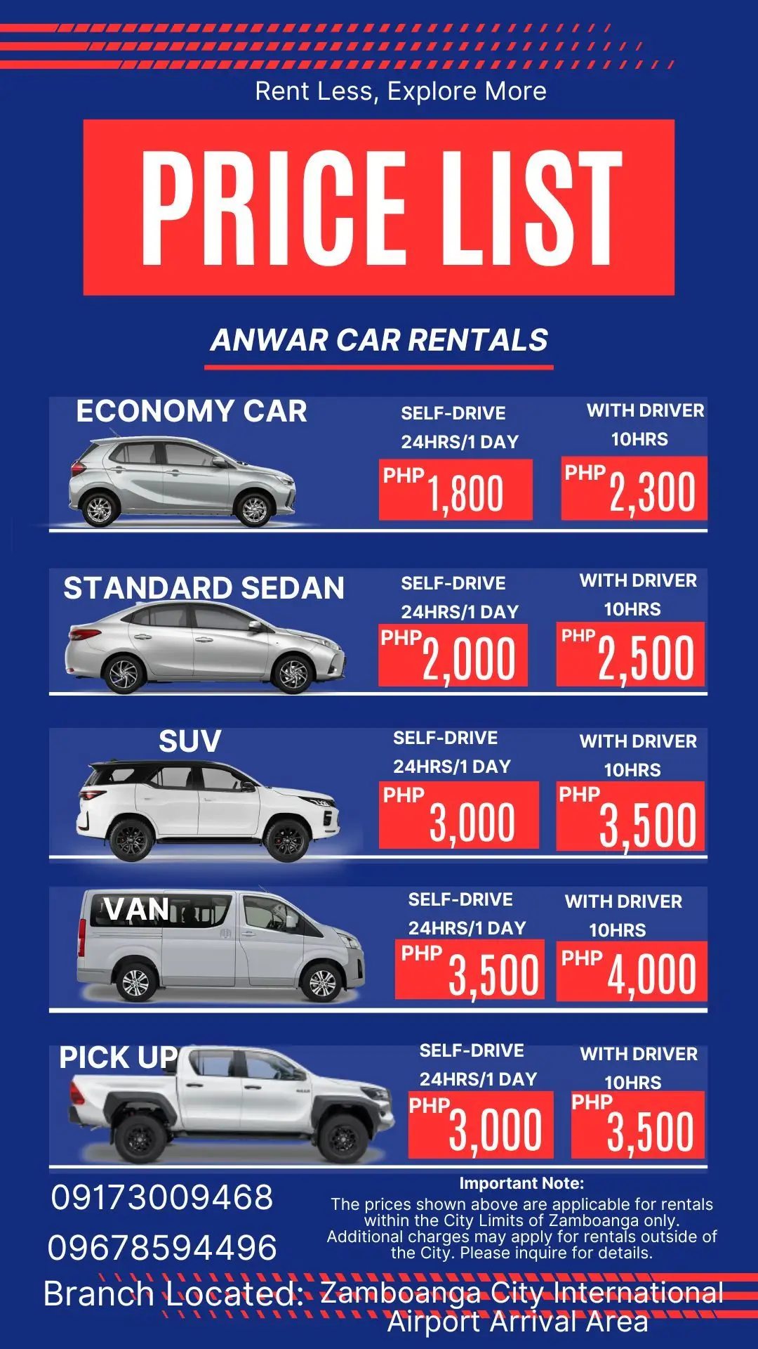 Anwar Car Rental offers flexible daily, weekly, and monthly car rentals right at Zamboanga International Airport, perfect for visitors and locals alike. Enjoy self-drive, chauffeur options, 24/7 roadside assistance, and hassle-free airport pickup and drop-off.